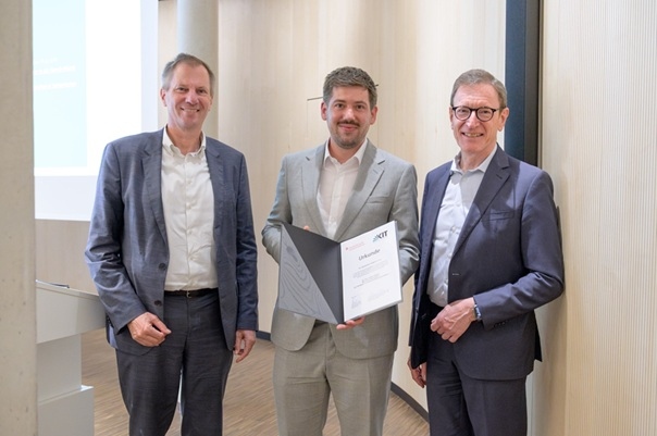 Foto: Prof. Oliver Kraft (Vizepräsident des KIT), Dr.-Ing. Fabian P. Hagen und Michael Huber (Sparkasse Karlsruhe).